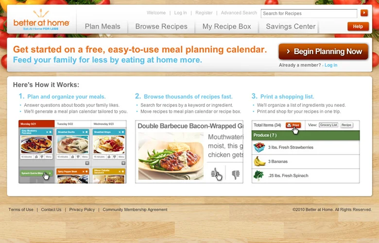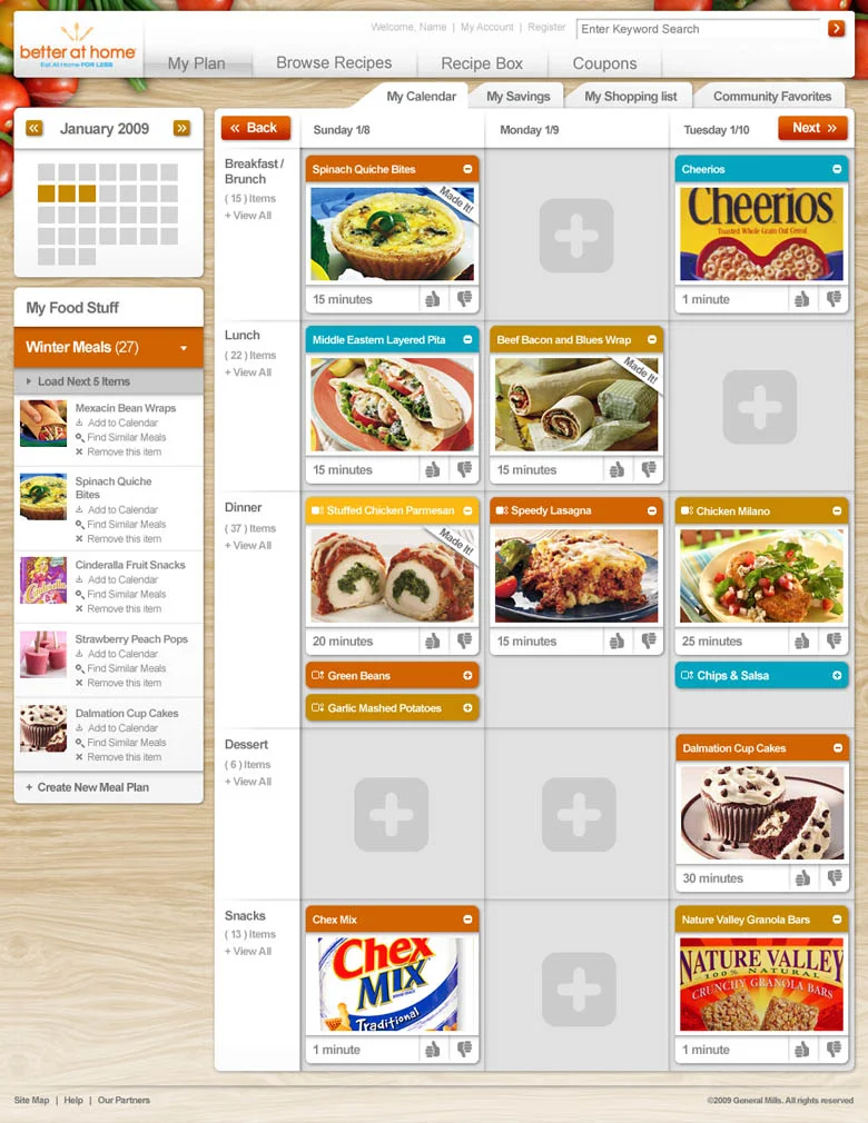 A online planning tool to help busy moms spend more time with the ones they love and save money on the things you love to do with them. The experience helped organize the weekly meal schedule by providing quick access to a range of options. The ability to set preferences on favorite recipes made finding and saving the right recipe easy.
